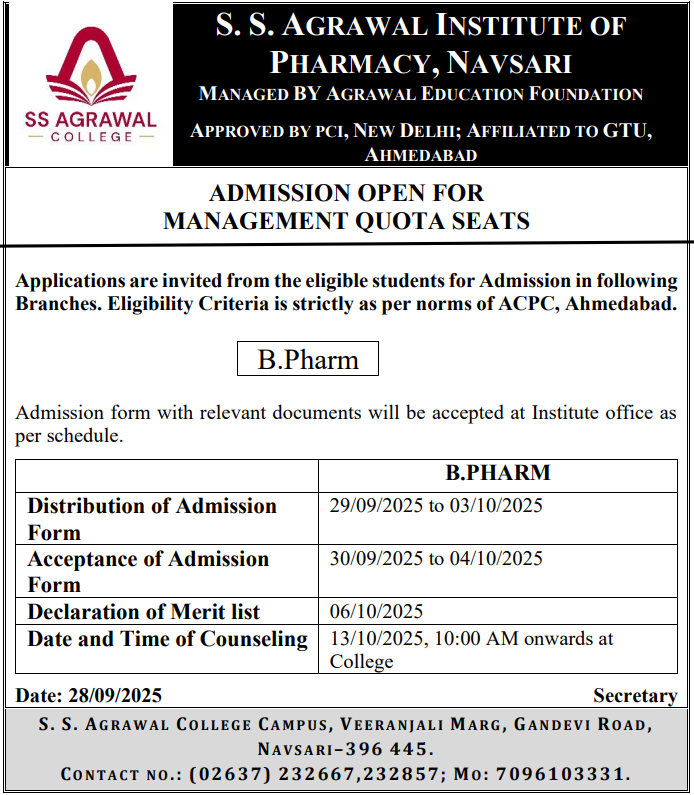 S.S. AGRAWAL INSTITUTE OF PHARMACY, NAVSARI was established in the year 2022 and is Managed by AGRAWAL EDUCATION FOUNDATION an institution with total commitment to quality and excellence in academic pursuit. The college is approved by the Pharmacy Council of India (PCI), New Delhi and affiliated to Gujarat Technological University (GTU), Ahmadabad.